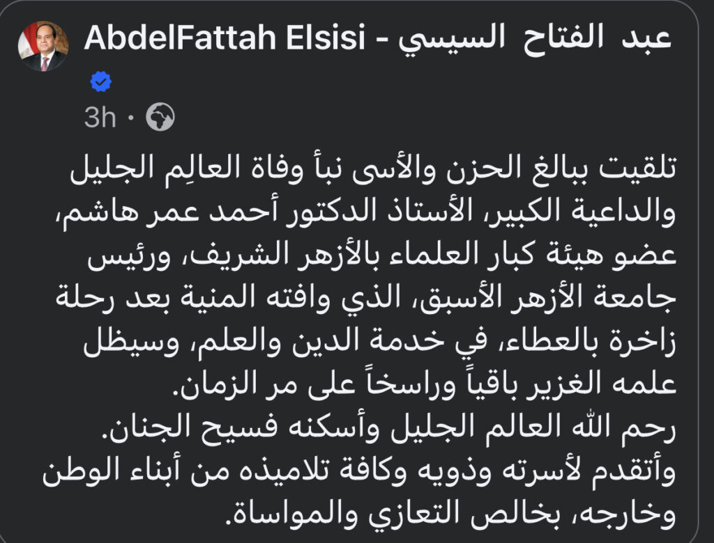 نعى الرئيس عبدالفتاح السيسي العالم الجليل أحمد عمر هاشم عبر صفحته الرسمية على موقع التواصل الاجتماعي فيسبوك وقال: