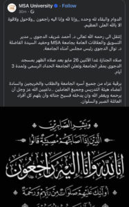 إنتقل الى رحمه الله تعالى د. أحمد شريف الدجوى ,, مدير التسويق والعلاقات العامة بجامعة MSA وحفيد السيدة الفاضلة د. نوال الدجوى رئيس مجلس أمناء الجامعة.