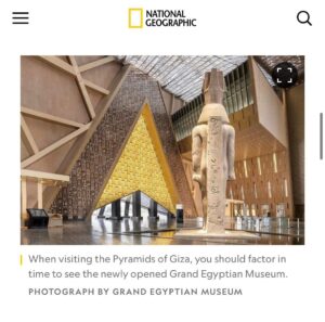 نشر موقع مجلة National Geographic Traveller الواسعة الانتشار تقريرًا صحفياً سلطت خلاله الضوء على سبعة من أبرز المواقع الأثرية حول العالم والتي يجب زيارتها، لما تمثله من قيمة إنسانية وتاريخية وأثرية فريدة. حيث تصدرت منطقة أهرامات الجيزة هذه القائمة، كما أوصى التقرير بزيارة المتحف المصري الكبير.